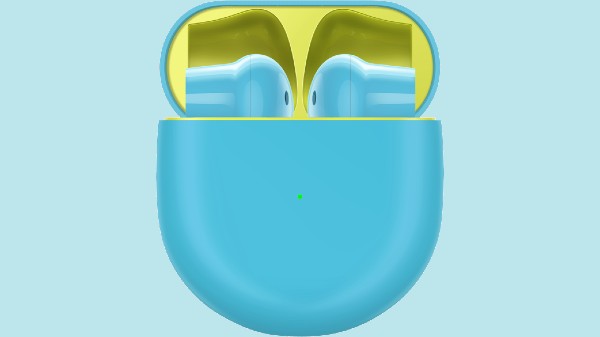 The OnePlus Buds have a matching color charging case and seem to have a matte finish. Particularly, the blue earbuds have a green interior on the charging case. The images also reveal an LED light on the exterior side of the charging case, which could be a battery indicator.