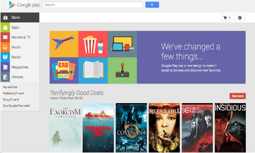 The web version of Google Play has been revamped to look more like the smartphone and tablet version. The store now has a more flatter and cleaner look, making it a lot more visually appealing. Moreover, it's much easier to navigate now, as content categories including Apps, Movies, Books and Devices, have been introduced on the left hand corner. Also, users can access their wishlist and redeem gift cards from the same corner.