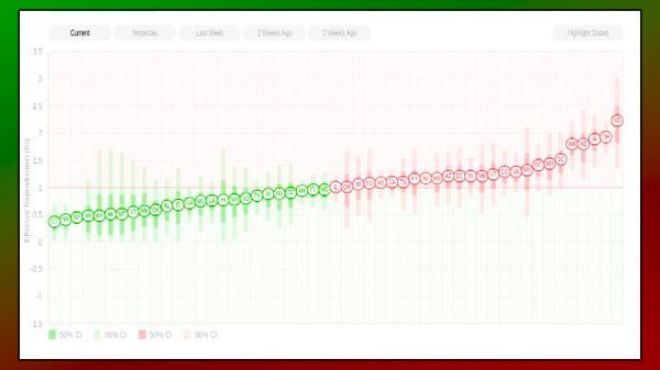 The latest update on the website showed that the state of Connecticut was the slowest with Rt at 0.37 and North Dakota the fastest with Rt at 2.2. Other states like New York, California, Ohio have Rt at 0.45, 1.1, and 1.9 respectively, shown in green and red. Further, a graphical representation of the Rt is also given for a better understanding of the spread of the virus over time.