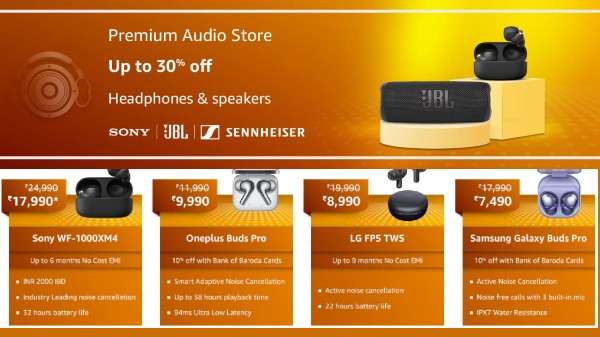The Amazon Audio Premium Store is offering the Sony WF-1000XM4 Industry Leading Active Noise Cancellation True Wireless with a 20 percent discount, bringing down the price to just Rs. 24,990. Similarly, the Oneplus Buds Pro Bluetooth Truly Wireless in-Ear Earbuds are available for just Rs. 9,990.
