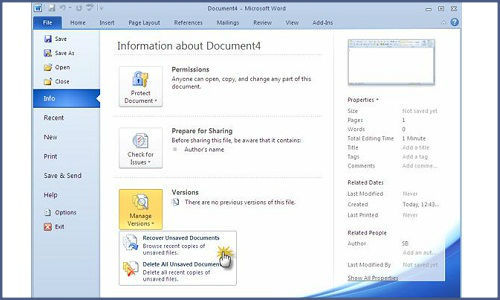 Note: The unsaved copies of the files will be saved on to the MS Word 2010 for a maximum of four days after which the file will get automatically deleted.