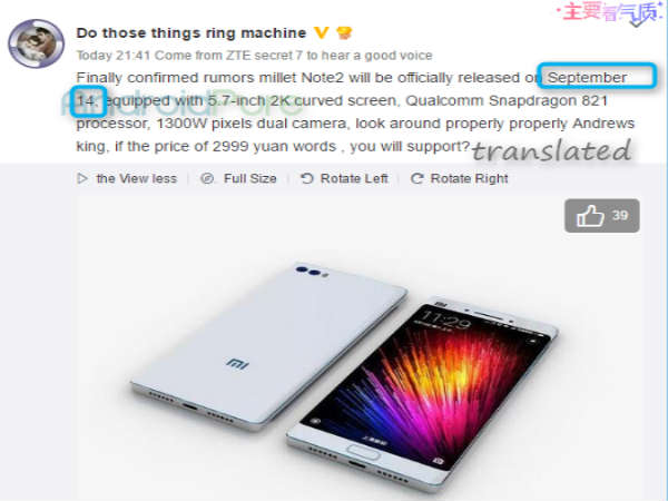 The Weibo post reveals that the Mi Note 2 might be officially announced on September 14. While this date is yet to be announced by the company, the post also reveals a few other details that are mentioned here.