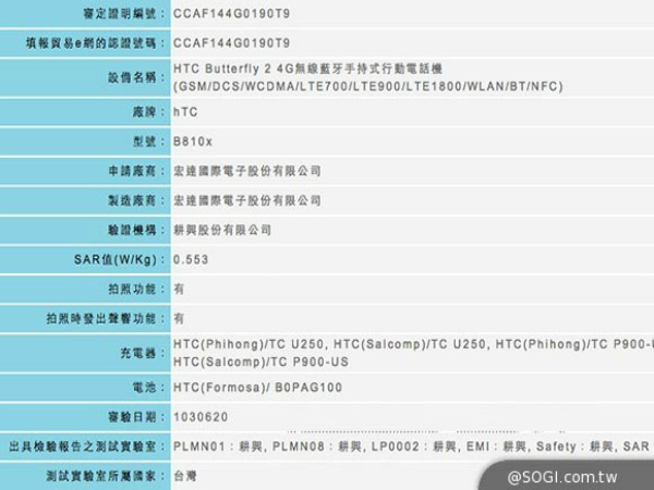 HTC's long-awaited premium handset is right around the corner, and today the Butterfly 2 pays a visit to the Taiwanese NCC under the moniker "B810x", Sogi.com reports. There's not much new information to be had in the report, although we do get confirmation that the HTC Butterfly 2 support for the LTE connectivity.