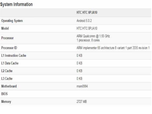 A code name was also noticed in the the benchmark results, HTC 09JA10. Further, reportedly the handset is said to come packed with Qualcomm MSM894 Snapdragon 810 chipset with 1.55GHz Octa-core processor. The fastest Cortex-A57 is clocked at 1.9GHz, but still there are lot of rumors that the latest Qualcomm snapdragon processor have some over-heating problems and this made the Geekbench to use the slower Cortex-A53 cores which is clocked at a lower frequency of 1.5GHz.