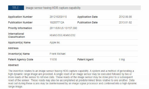 The actual patent abstract from the China Patent Office Trademark reads, "The invention relates to an image sensor having HDR capture capability. A system and a method of generating a high dynamic range image are provided. A single reset of an image sensor may be executed followed by two or more reads of the sensor to retrieve data. These reads of the image sensor may be done prior to a subsequent reset of the sensor. These reads may also be accomplished at predetermined times relative to one another. Data read out during these scans may be deinterleaved by an image signal processor and combined into a high dynamic range image."