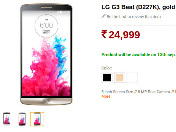 However, the e-commerce site notes that it will start shipping the phone starting September 13. Thus you can expect an official launch of the LG G3 Beat sometime around the second week of September. The device is currently being offered in three color variants viz. Black, Gold and White.