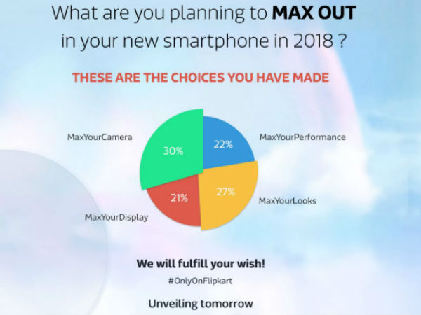 Apparently, Flipkart has conducted a survey asking people what are the features that they plan to "Max Out" in their new smartphone. The survey shows that 30 percent of the people opted for the "MaxYourCamera", while 27 percent of the people voted for the "MaxYourLooks" option. Going by the survey results, it seems Flipkart's upcoming smartphone will be camera-centric with a great design.