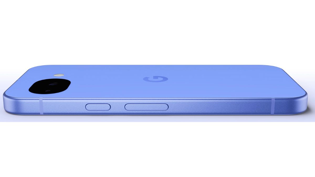 The phone is shown in a blue colourway and appears to stick closely to the design language of its predecessor. It features a flat metal frame and a pill-shaped camera island on the back that houses a dual rear camera setup. The power button and volume controls sit on the right side, following Google’s usual layout.