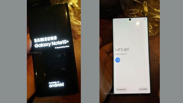 The camera lenses are stacked vertically on the top-left of the rear panel accompanied by an LED flash. The images leaked also shows the bootup screen where one can easily see the Galaxy Note 10+ model name.
