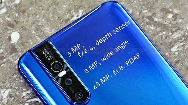The phone has a triple camera setup with a 48MP primary sensor, 8MP ultra-wide-angle sensor, and a 5MP depth sensor. There is a 32MP pop-up selfie camera with support for face unlock and 1080p video recording capability. The smartphone is juiced by a 3700 mAh battery with support for fast charging via micro USB port.