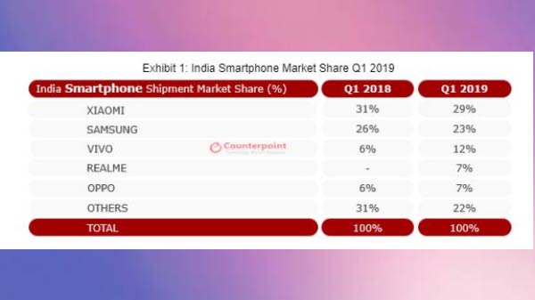 Xiaomi remained the smartphone market leader in Q1 2019 with a 29 percent market share, though its shipments declined by 2 percent YoY, according to Counterpoint's "Market Monitor" service report.