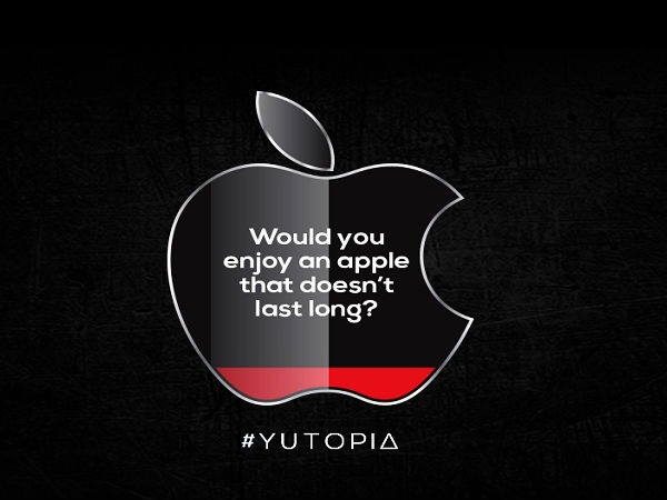 The recent teaser shows an Apple logo with a low battery indication and a caption stating, "Would you enjoy an Apple that doesn't last long?" It is quite clear from the teaser that the YU Yutopia will sport a large battery on the inside.