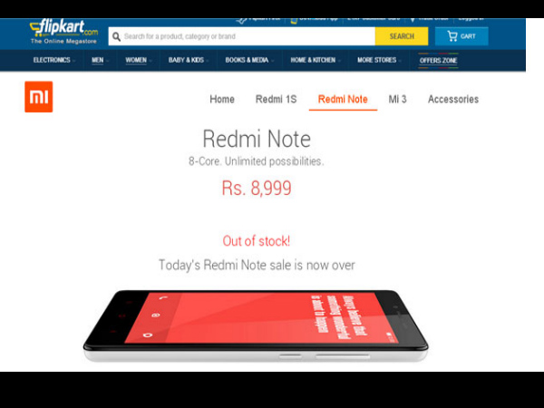 Via social networking site Twitter, Hugo Barra has mentioned "Mi India: Redmi Note out of stock in 6 secs today! @Flipkart @MiIndiaOfficial"