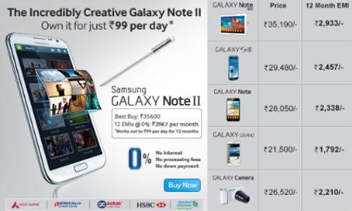 Samsung has kicked off 12 month EMI scheme on its official eStore for devices including Galaxy Note 2, Galaxy S3, Galaxy Note, Galaxy Note 800, Galaxy Grand and Galaxy Camera. According to media reports, Samsung officials have claimed that the EMI campaign will run for over a month and that the company has collaborated with digital media and retail stores across the nation for this EMI scheme.