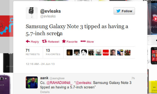 After a series of leaks and rumors now Twitter user @evleaks has tweeted saying that Samsung Galaxy Note 3 will come with a 5.7-inch display. However this is quite contradictory to the earlier news reports and rumors that suggested that the phablet will come with a 5.99-inch full-HD Super AMOLED display with diamond pixel structure.