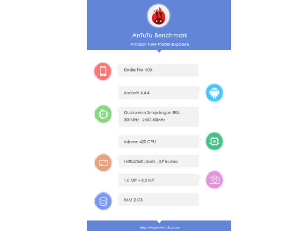 Thus, Amazon Kindle Fire tablet lovers can expected a more powerful version of the tablet device soon in the market. The AnTuTu benchmark database shows that the tablet would be powered by a 2.5 GHz quad-core Snapdragon 805 CPU with Adreno 420 GPU and run on Android 4.4.4 (KitKat) with the company's proprietary Fire OS layered on top.