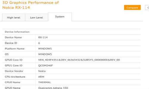 Now the update is that a Nokia device having model RX-114 has been spotted on GFXBench. The device is seen sporting a 1371 x 771 p display, quad-core processor (probably snapdragon 800), Adreno 330 GPU and again there is no information on the which version of Windows OS the tablet will be running on.