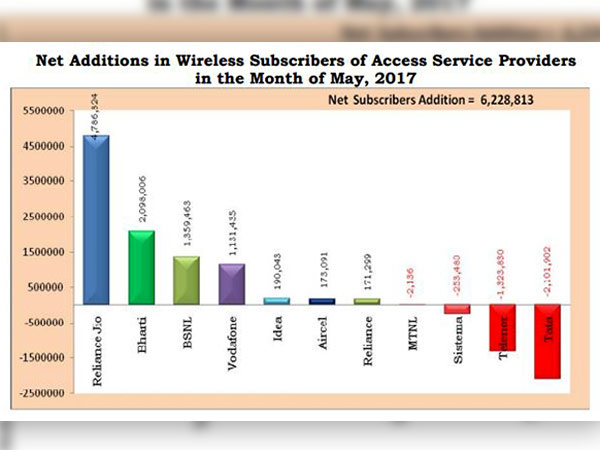 Meanwhile, BSNL has added 1.35 million new subscribers, followed by Vodafone India with 1.3 million and Idea Cellular 0.19 million.